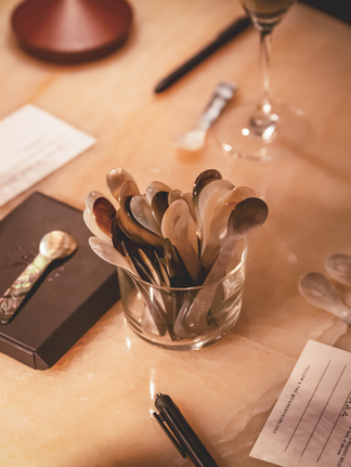 Given the nature of mother of pearl spoons, they each have naturally intricate patterns that guests were able to choose from; some darker, some lighter, and some a mix of both. Something I didn't know before this event, was that the nature of the material is non-reactive and actually preserves the flavor of caviar, as opposed to a metal or wooden spoon.